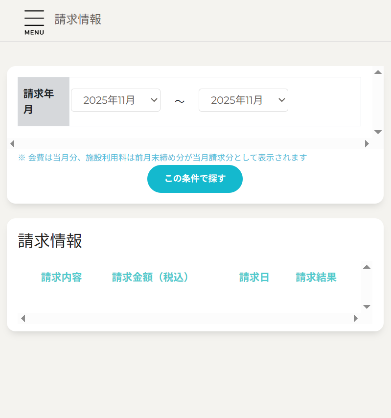 ● 施設を利用した場合、次月の請求(後払い)で処理されます。お支払金額をご確認ください。